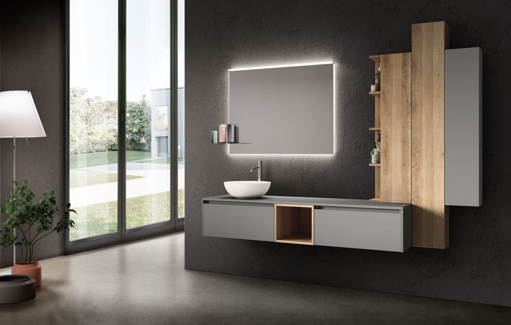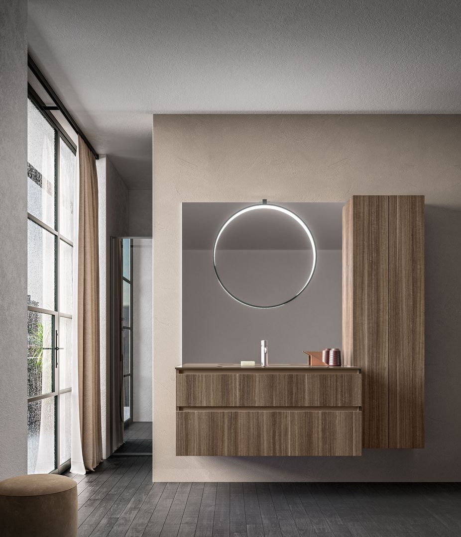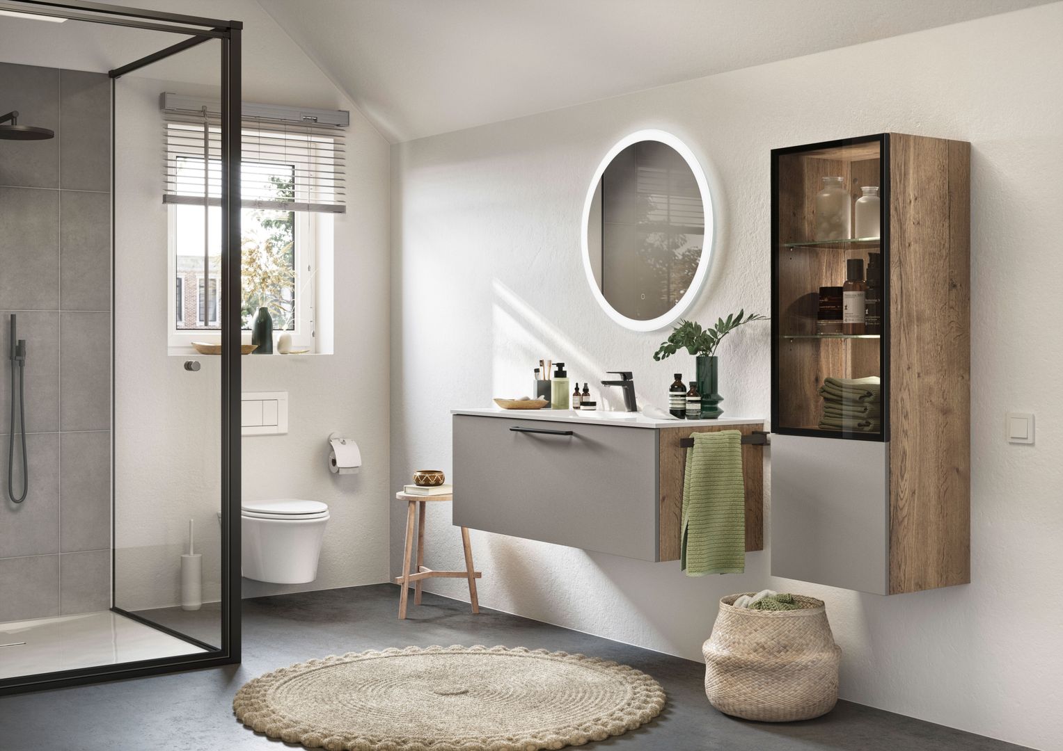 Das Badezimmerlicht sollte nach Möglichkeit freundlich sein. Denn wenn einen das eigene Spiegelbild nicht nur unausgeschlafen, sondern auch bis ins letzte Detail ausgeleuchtet am Morgen begrüßt, dreht man am liebsten gleich wieder um. Für einen guten Start in den Tag ist daher eine ausgewogene und stimmungsvolle Beleuchtung vorteilhaft. Sie sorgt außerdem für ein freundliches Wohlfühlambiente und ideale Lichtverhältnisse. Eine extra Wandlampe oder eine dimmbare Spiegelleuchte machen da bereits einen großen Unterschied.